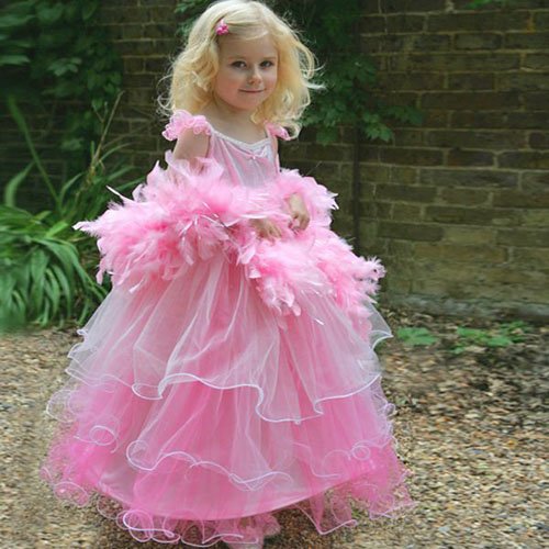Une robe pleine de froufrous pour jouer à la princesse.Avec le boa en plumes roses, votre princesse sera comblée!Bustier en velours rose extensible, superposition d'un jupon de satin rose et de 3 jupons en tulle rose. Vous pourrez donner encore plus d'ampleur à cette robe en utilisant le cerceau fourni. Robe lavable en machine à 40 °