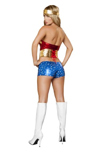 4 piece wonder heroine includes sequin top, waist cincher, metallic star shorts, and headband. Color: red and blue