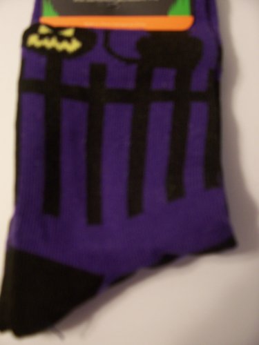 Halloween Crew Sock ~ Black Cat and Jack-o-lantern on Fence. Perfect for Halloween and parties! 96% Polyester, 3% Spandex, 1% Rubber