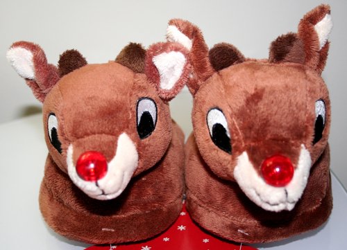 These adorable slippers feature a Rudolph the Red Nosed Reindeer head in front and the words “Rudolph the Red Nosed Reindeer” in back. With each step, his Rudolph nose lights up bright and red.