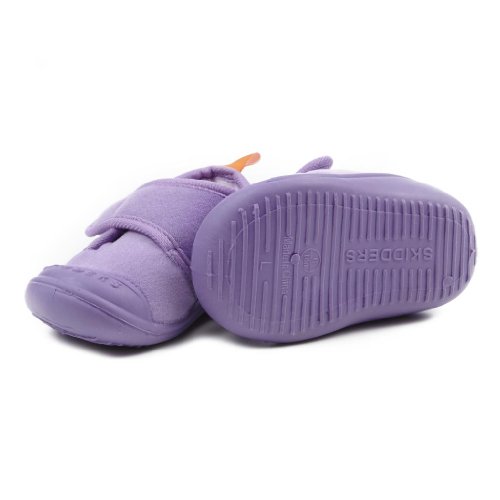 Skidders Gripper Slippers, plush inside and out, with Velcro – soft and durable outsole for indoors and out . ***Size 4= fits up to a 4.25″ foot (average age 12 mos); **Size 6= fits up to a 4.75″ foot (average age 18 mos); **Size 8= fits up to a 5.50″ foot (average age 24 mos). The Gripper Slippers run smaller than the Skidders Sock Shoes.