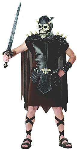 The Skulltar, The Barbarian Costume features a poly tunic, hood, mask, shoulder armor, chest plate, waist armor, wrist guards and leg ties.