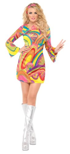 This sexy hippy costume consists of a short multicoloured dress with large sleeves and a matching headband (earrings, tights and shoes are not included). This high quality costume will turn you into one of the most sexy hippies for fancy dress parties or a show.