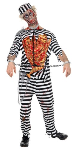 This zombie convict costume for adult consists of a shirt, trousers, a cap and a prisoner chain. The shirt and the trousers are comfortable and loose-fitting. The bloodstained shirt has a fake plastic entrails on the front. The plastic prisoner chain allows you to tie your hands and your neck ( make-up and shoes not included). This costum is ideal for scaring your friends on Halloween or other francy dress parties.