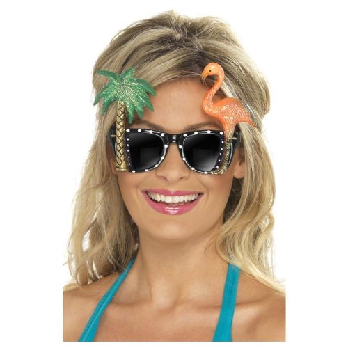 Funny pair of glasses. This pair of black glasses is original and fun. There is a palm tree and a pink flamingo on each side. It is ideal to complete your costume for beach parties or fancy dress parties with friends.
