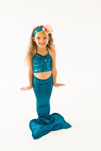 At Applejack Apparel, we create awesome mermaid costumes for a fraction of the cost of higher end “swimming tails.” This costume is designed to get wet – let her wear it in the bathtub or kiddie pool to play, as well as for adorable pictures! This tail does restrict movement, so children who wear it must be supervised even in shallow water. It is not meant for swimming or use in chlorinated water or on rough surfaces, as it damages the fabric. Each tail is sewn to last through many hours of mermaid play and has stretchy fabric which is forgiving and comfortable. This can be hand washed and air dried. Let your favorite girl be the most dazzling mermaid in the lagoon with one of our mesmerizing tails, and purchase a top to match (we offer two styles in the same fabric).