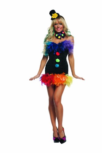 • Rainbow feather boa trim at hem and front neckline, pom pom buttons at front dress, mii hat with headbad