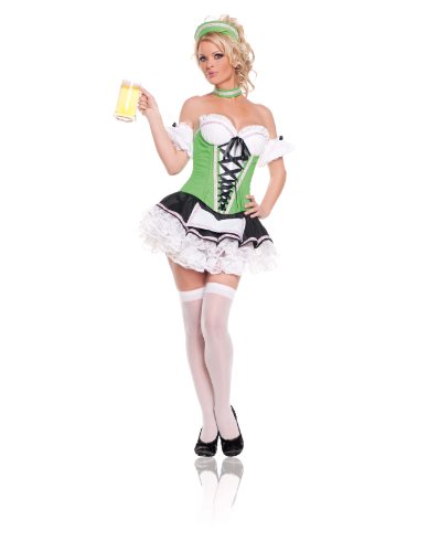 Set includes corset, skirt, arm puffs, headpiece and neckpiece