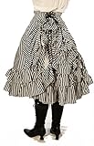 A lightweight 2 layer broadcloth skirt with flow and flair. Back corset style lacing will allow for 3-4 inches to fit each size, so even if you are close, as long as you choose where the maximum falls above your natural waist size, you'll get an excellent fit. See additional pics for actual top of skirt image. This is a high waisted skirt that goes in at the natural waist, that is where you want to measure. Has 2 drawstrings at the back and you just slide the material of the outer layer up the drawstring to create as much bustle as wanted and still have a full length layer below. 2 layers of ruffles are stationary to the hem, and 2 layers are what bustle in back, but also can be tucked up and played with in front. Wear with a petticoat for fullness, or on it's own. Remember, choose a size where your waist is below the maximum. Length is below the knee. Corsets shown not included. Skirt only. 31-32″ long.