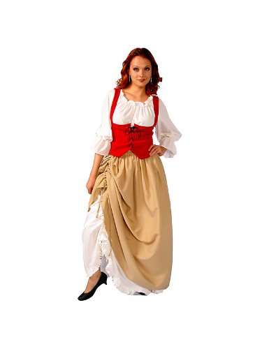 The Tavern Maiden Costume for Women will take you back in time! This Renaissance look comes with blouse, vest, skirt and underskirt. The peasant style blouse is white and comes with red vest that has a crisscross lacing in the front that comes right under the bust line. The tan skirt comes with a side tie that lets you scrunch up the hemline and show the white ruffled underskirt. This costume is great for Renaissance fairs, plays or just works as a great Halloween costume!