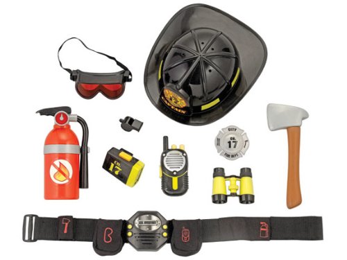 This firefighter-themed interactive role-play set with sound effects will have your little one ready to save the day. With 20 sound effects in the included action sounds belt, this fun toy encourages fire-safety in an imaginative way. Deluxe role-play set includes: action sounds belt with 20 sound effects, fireman's helmet, vest (with slot to insert badge and name tag), working flashlight (clips on hat), badge, binoculars, whistle, and 4 accessories that clip into the belt (goggles, handheld radio, fireman's axe, and fire extinguisher).