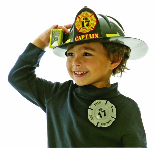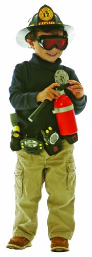 This firefighter-themed interactive role-play set with sound effects will have your little one ready to save the day. With 20 sound effects in the included action sounds belt, this fun toy encourages fire-safety in an imaginative way. Deluxe role-play set includes: action sounds belt with 20 sound effects, fireman's helmet, vest (with slot to insert badge and name tag), working flashlight (clips on hat), badge, binoculars, whistle, and 4 accessories that clip into the belt (goggles, handheld radio, fireman's axe, and fire extinguisher).