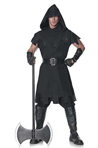 Heads will roll in this deluxe medieval tunic, including detailed collar with attached hood, pants, studded arm cuffs, and vinyl belt.