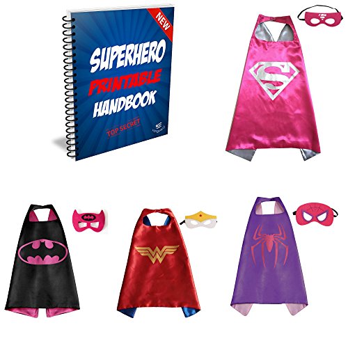 Perfect gift for any young Superhero! Great for birthday parties, playdates, pretend play and an easy Halloween costume. Our four-pack includes the popular Superheros: Spidergirl, Batgirl, Supergirl and Wonder Woman. Each set arrives ready to wear with a cape and mask. Capes are high quality double sided satin with an easy velcro neck fastener for younger children. Masks are also high quality, made of felt and comfortable to wear. Capes measure 24″ tall by 26″ wide. Masks measure approximately 6 1/2″ wide and 3″ to 4 1/2″ tall (depending on style). Capes may be hand washed in cold water and air dried. The printable Superhero Handbook is emailed to you with your order.