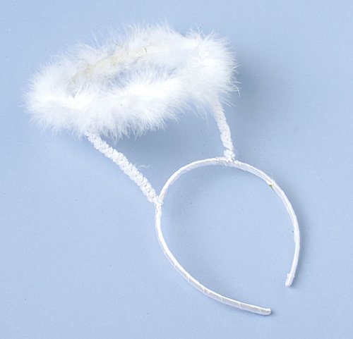 This angel halo is made with soft feathers and sits atop a headband. The halo will accessorize any angel costume. Great for use in Halloween customs or Christmas Pageants.