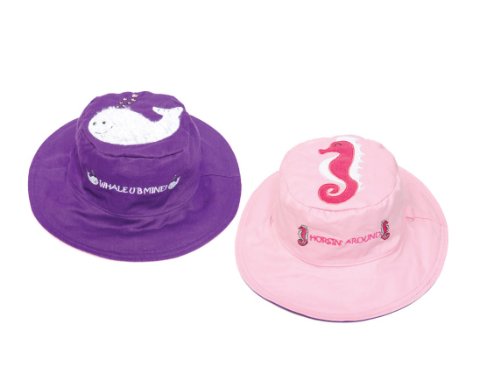 Fun and functional! Unique 100 percent cotton reversible sunhats. Size small (6 months 2 years). UPF 50+ sun protection. Each hat has a clever embroidered saying on the front as indicated and reversible chin straps. Dimesnions:. Depth:3.5. Width:12. Length:12