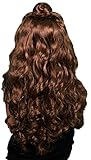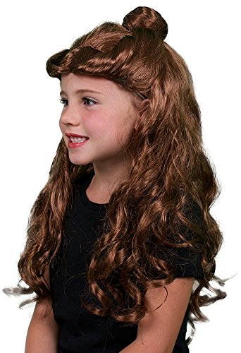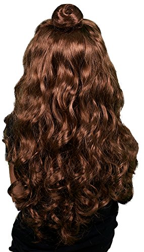 Wig showcases stunning brown curls in a beautiful upsweep, perfect for a date with the Beast.