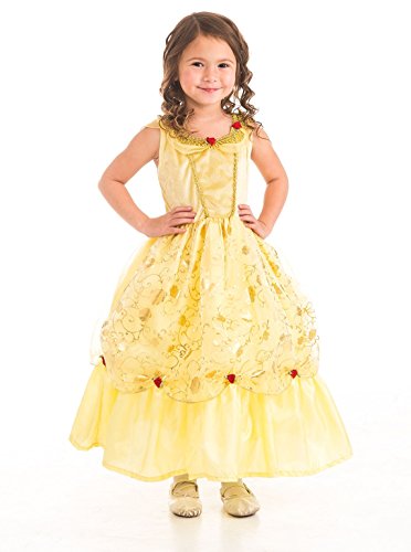 Transform into the Belle of the Ball in this newly redesigned charming fairytale classic. The stretchy yellow velvet bodice is gracefully designed with sparkling gold trim and an elegant collar adorned with red rose accents. The printed gold rose overskirt adds a dash of dazzle to the princess in you. Red flower headband sold separately. Features: Clothing quality fabrics; machine washable. Stretchy, soft and very comfortable. Sizes: S-XL