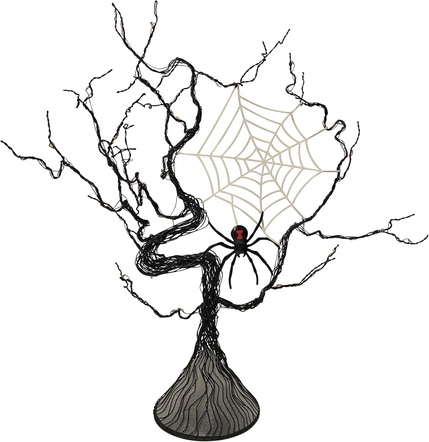 • Spooky Tree – The black metal knarled branches of the tree hold up the spider and her web, and the orange LED lights give it a spooky ambiance perfect for the spooky season